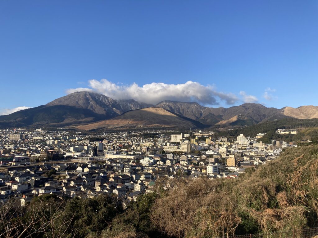 別府の温泉街から上がる湯けむりと