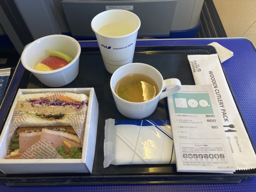 - お昼時間帯のフライトで軽食付き