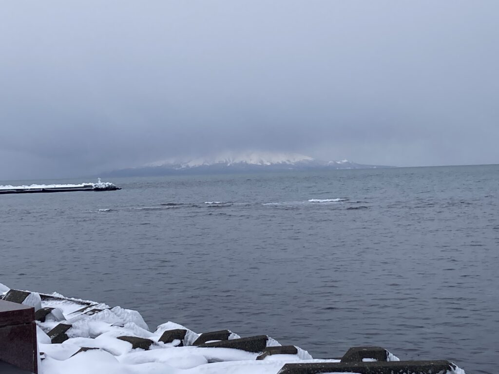 左に利尻島(利尻富士)、右に礼文島。